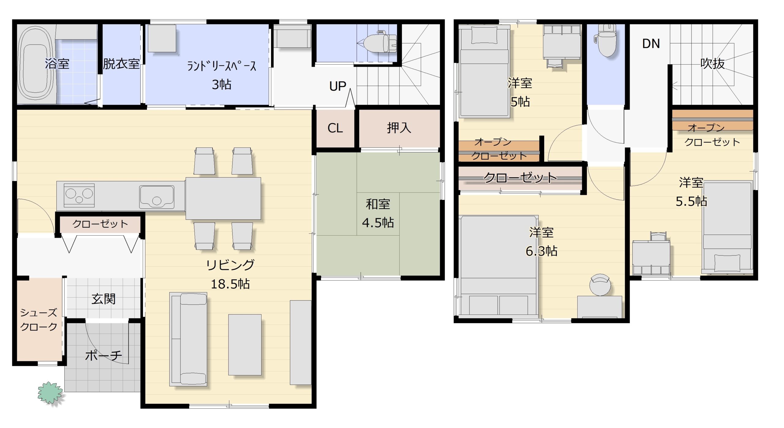 | 間取り / 詳細 | 4LDK LDK 18.5帖/洋室 6.8帖/洋室 5.5帖/洋室 5.0帖/和室 4.5帖 |